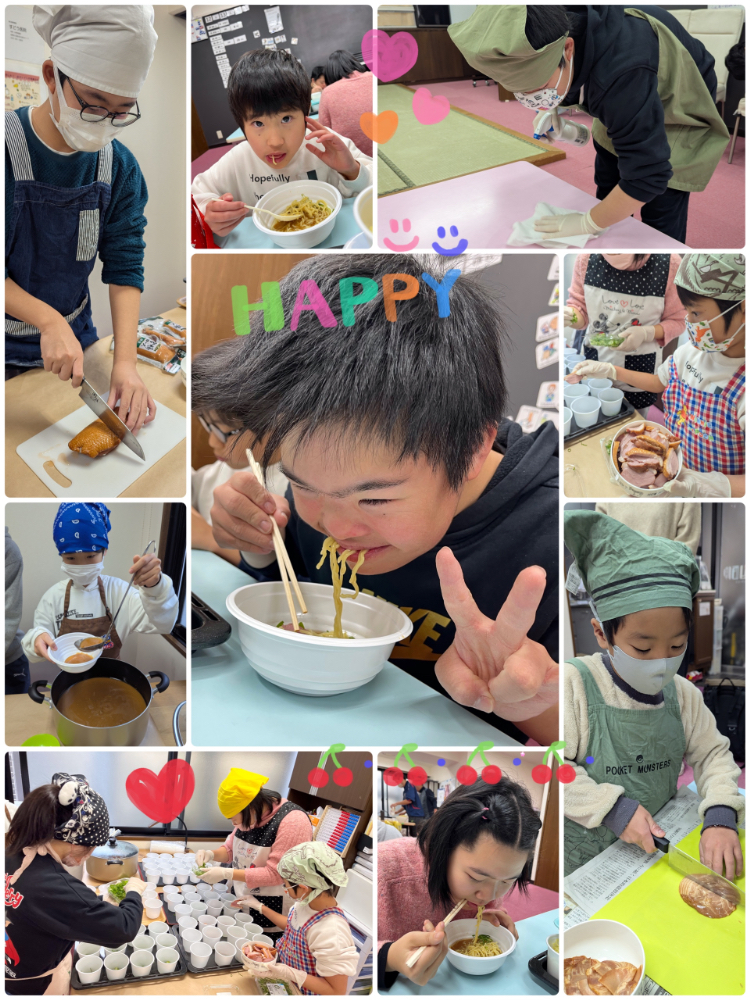 みんなで焼豚や鴨肉を切ったり、ネギや具材をカップに入れました。