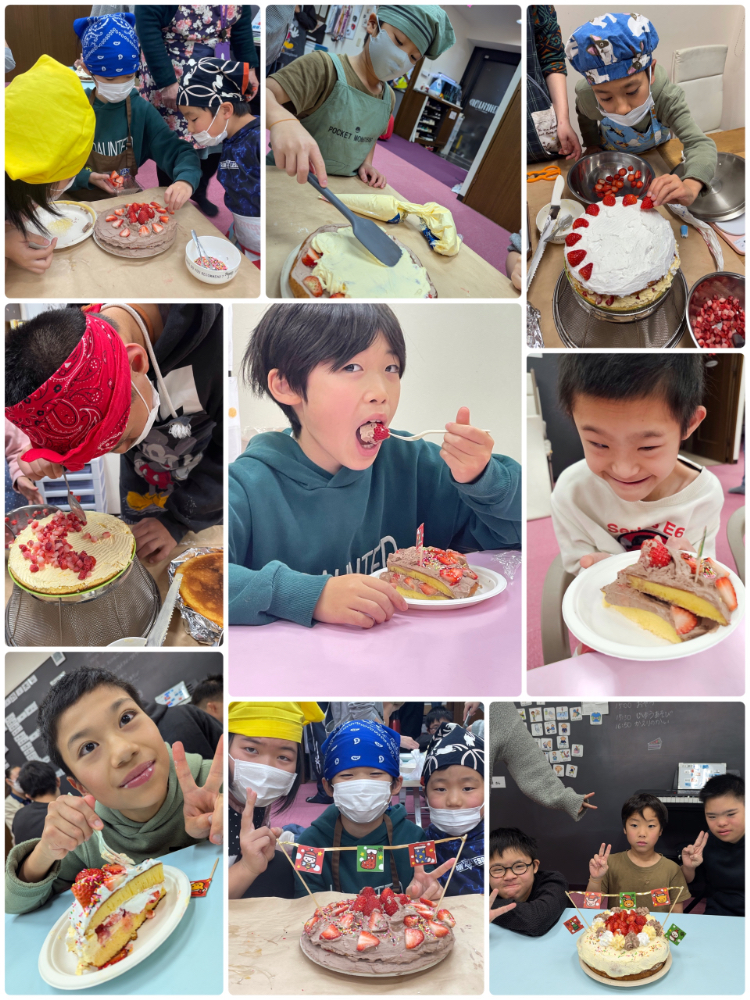 材料を計り、混ぜて、焼いて、デコレーション……、工程の多いスイーツでしたが、美味しく出来上がったケーキをみんなで味わうことができました😆