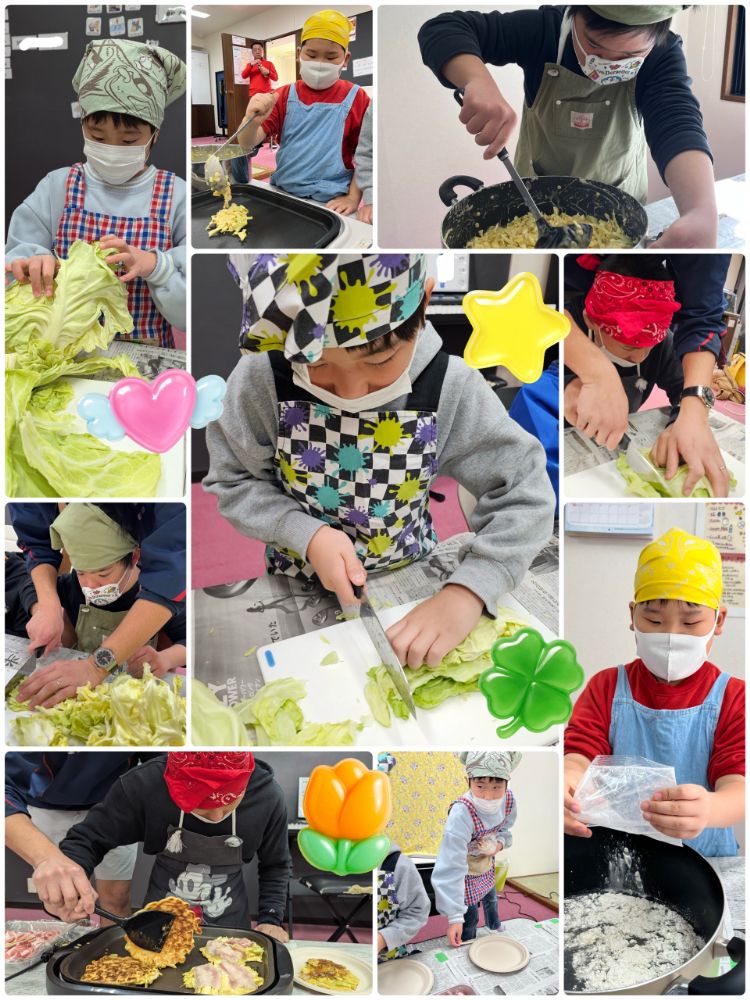 キャベツの千切りチームと、生地作りチームに分かれて作業開始👩🍳